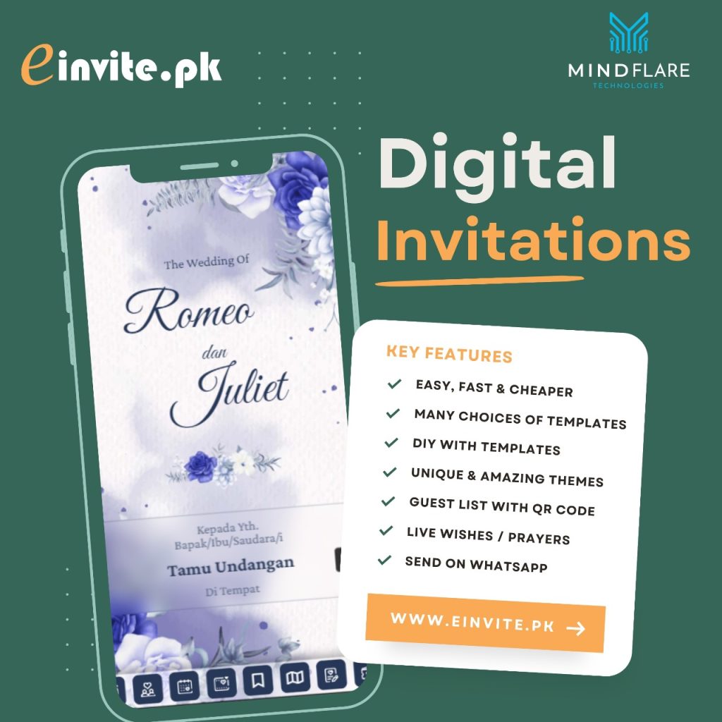 einvite.pk is a digital invitation website we created to help our client with an electronic alternative to the traditional paper invitation. You can create, send, and manage invitations for different events all at once. It is built using PHP for easy maintenance and updates, JS built digital invitation for interactive user experience, and MYSQL database for responsive data management and faster proceeding. It also provides a convenient RSVP management system.